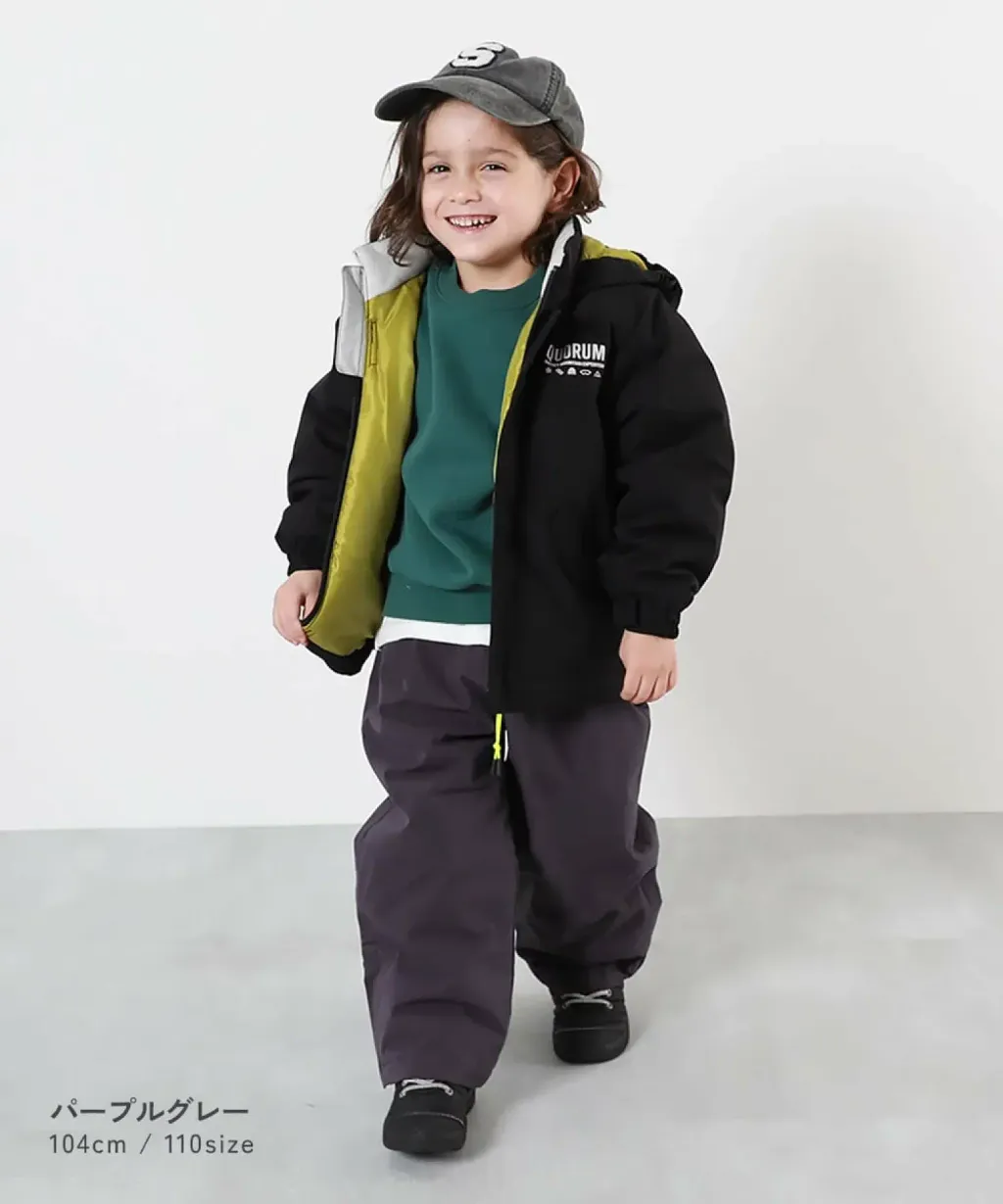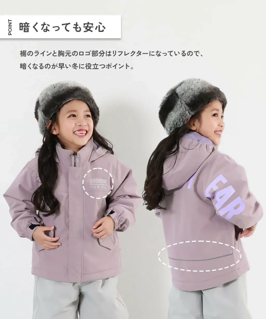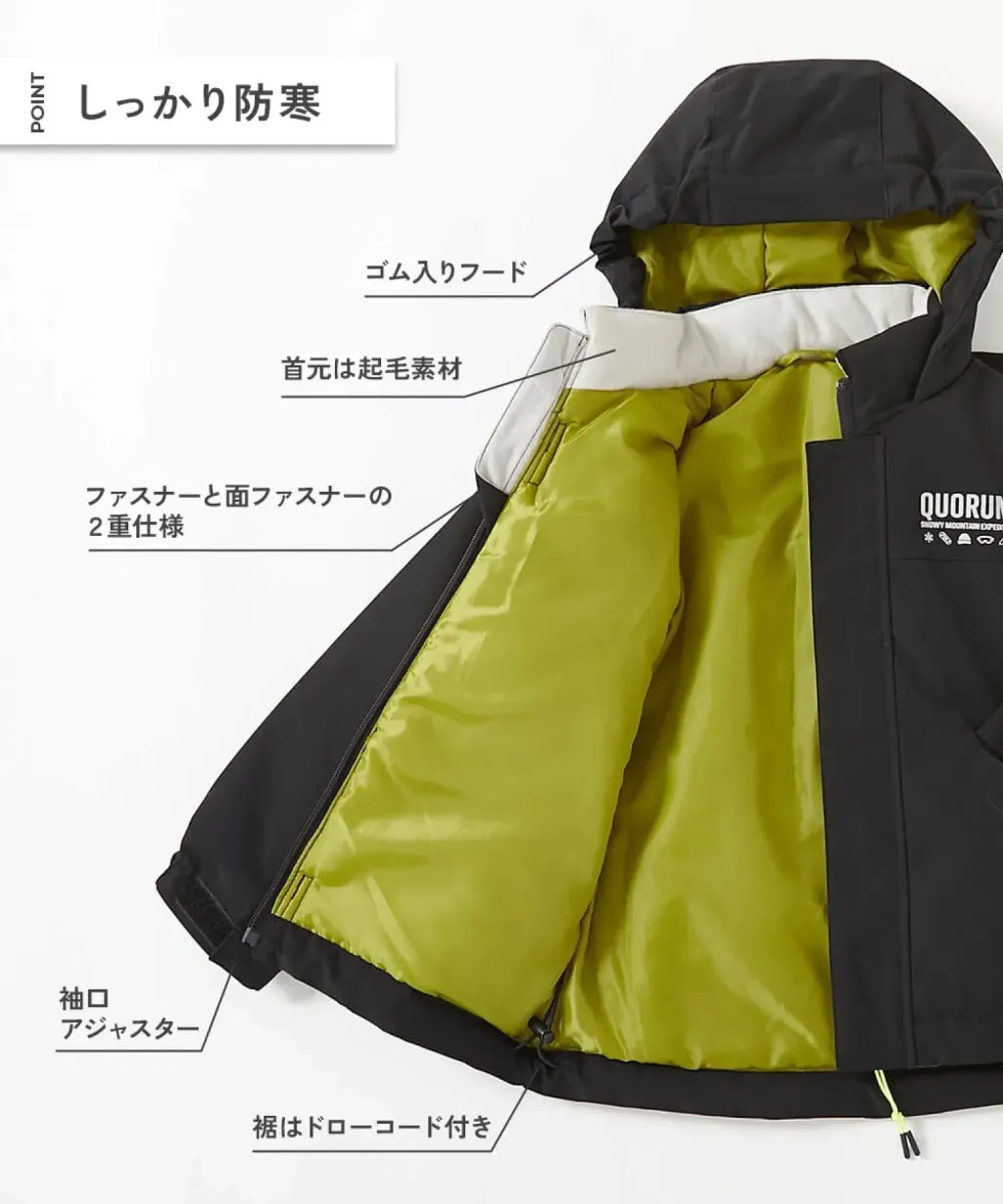 這款滑雪服採用防水(防水性能超過 5000 毫米)布料,有效防止雪水滲入。推薦在寒冷地區通勤上學或去托兒所,或作為滑雪服穿著。