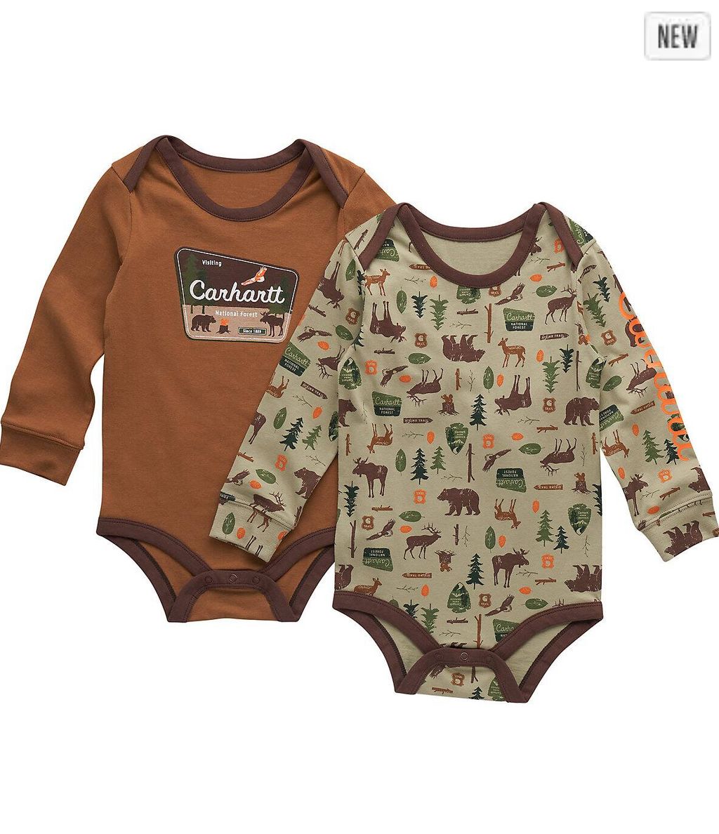 兩件均採用 Carhartt 堅固耐用布料,可輕鬆應對各種冒險。兩件組均配有按扣,方便快速更換。兩件套裝皆以駝鹿、熊和小鹿為主題,彰顯自然之美。