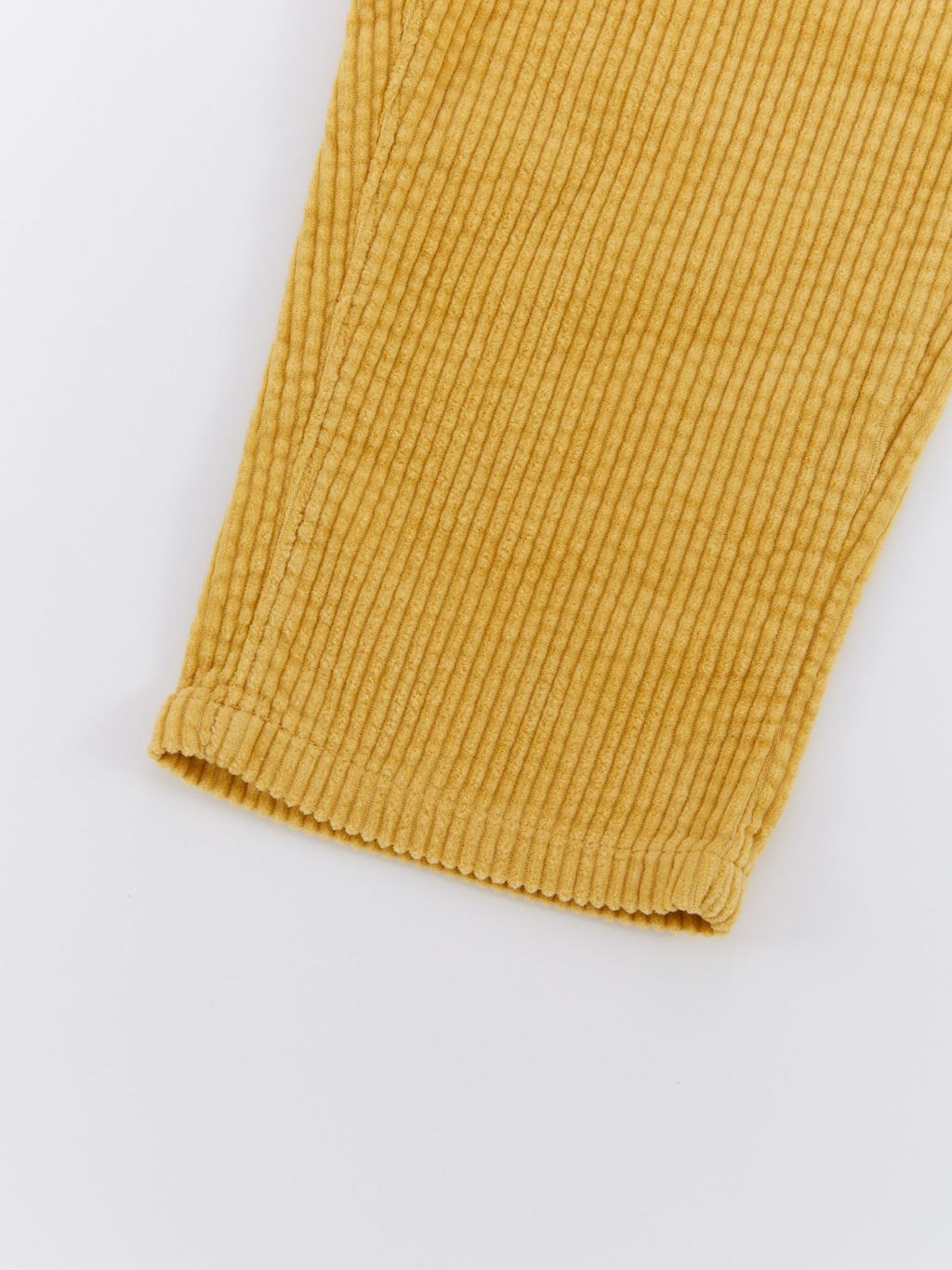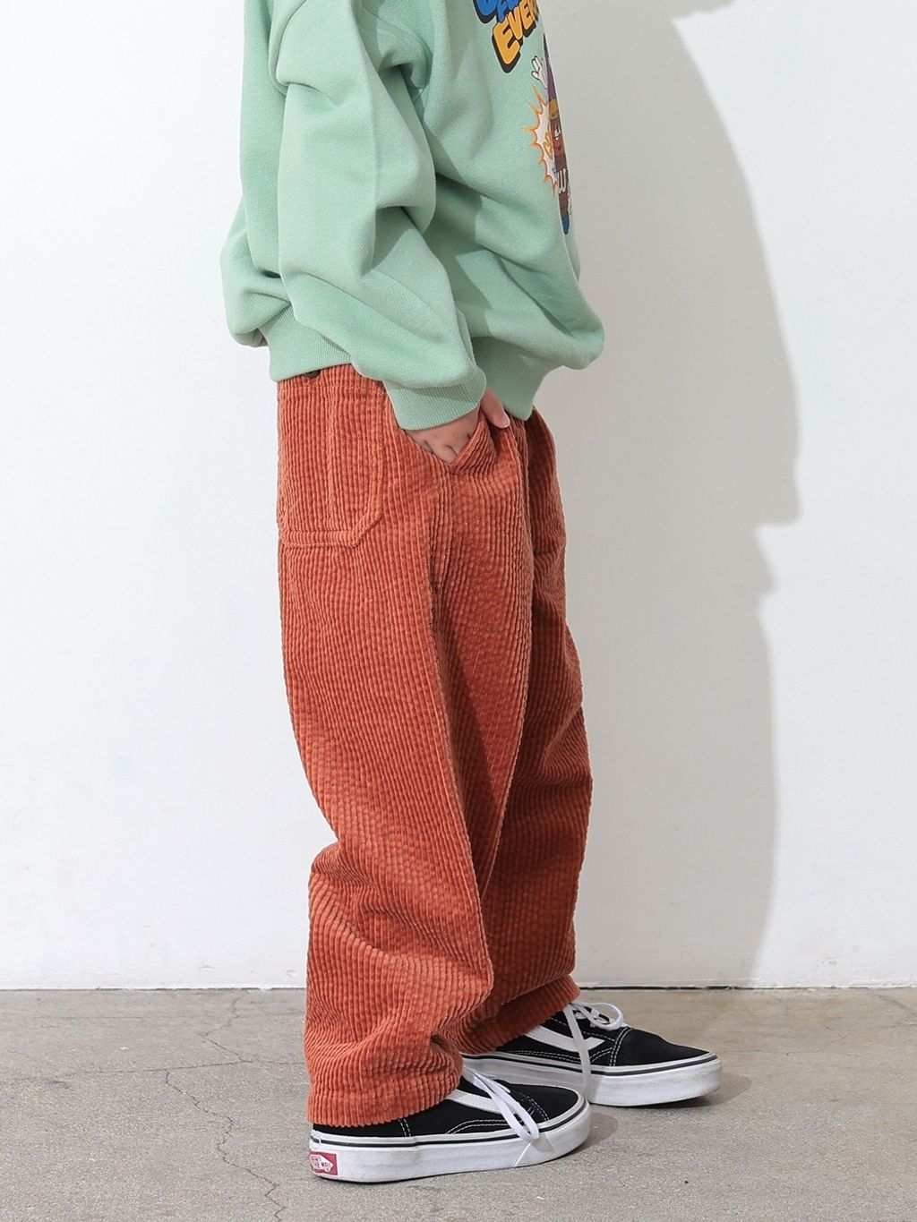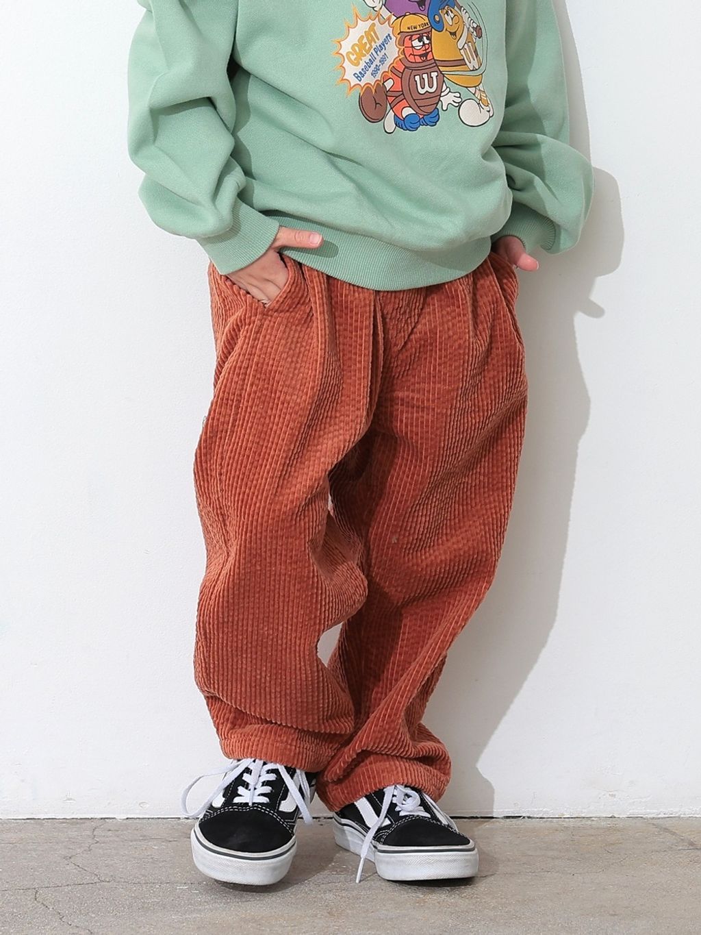 褲型是寬鬆的收窄長褲,燈芯絨材質柔軟舒適、質感佳,已經連續2季都有幫兒子購入的舒服時髦褲款!褲長反折穿也很好看。