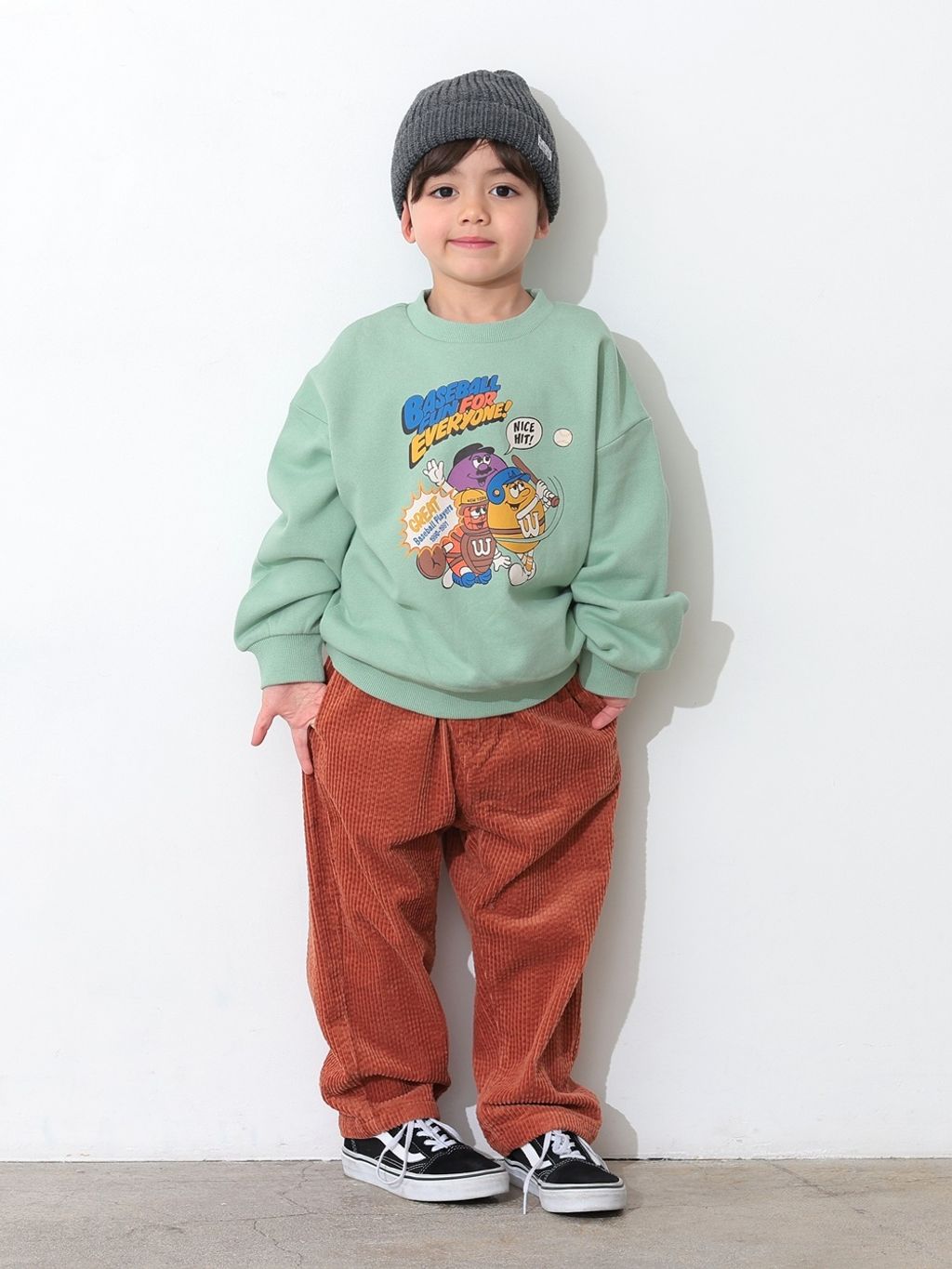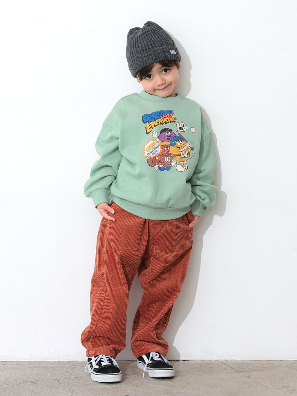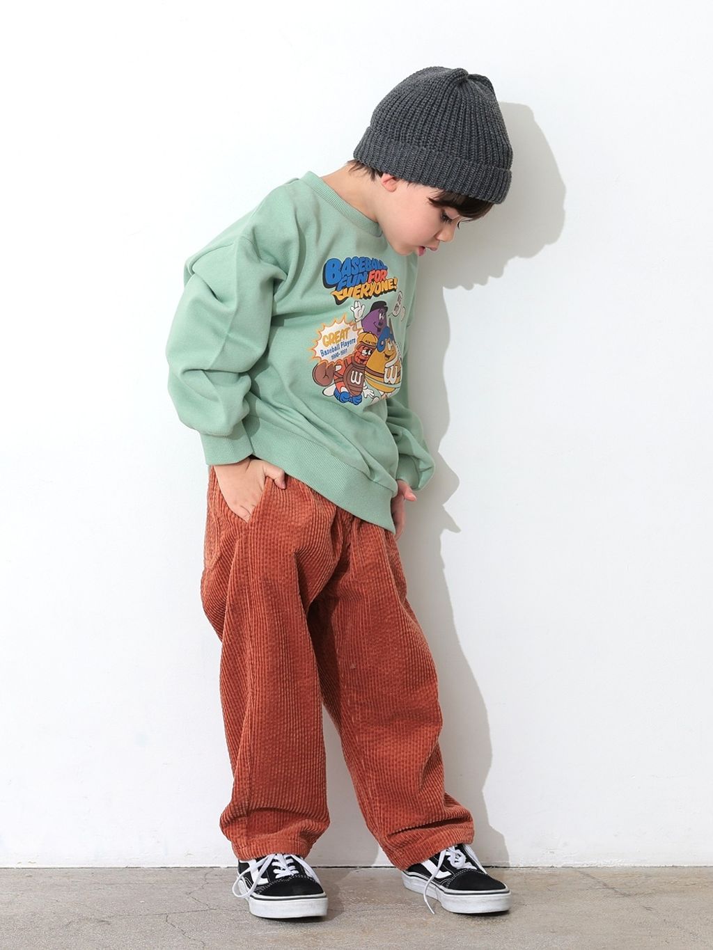 褲型是寬鬆的收窄長褲,燈芯絨材質柔軟舒適、質感佳,已經連續2季都有幫兒子購入的舒服時髦褲款!褲長反折穿也很好看。